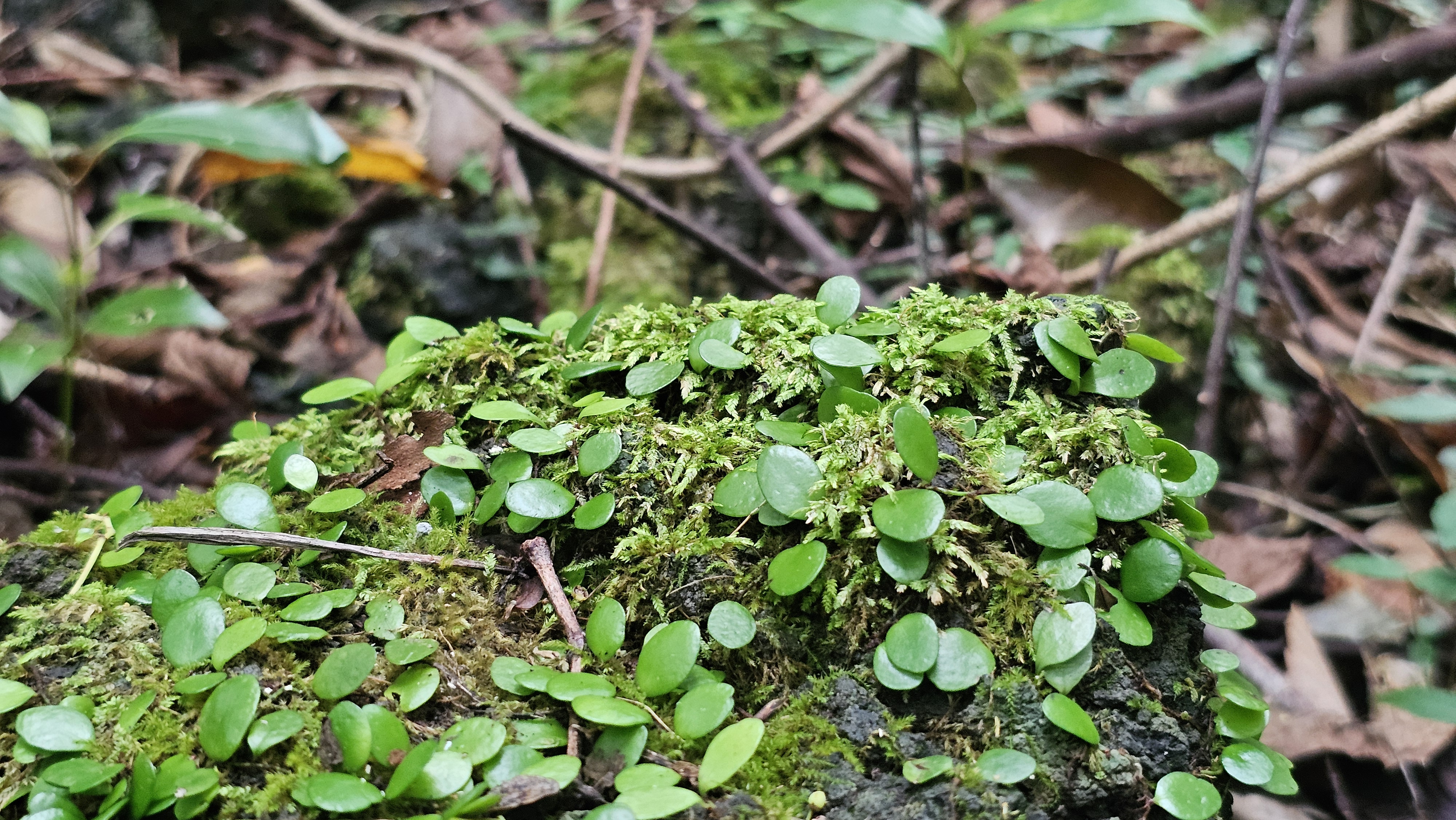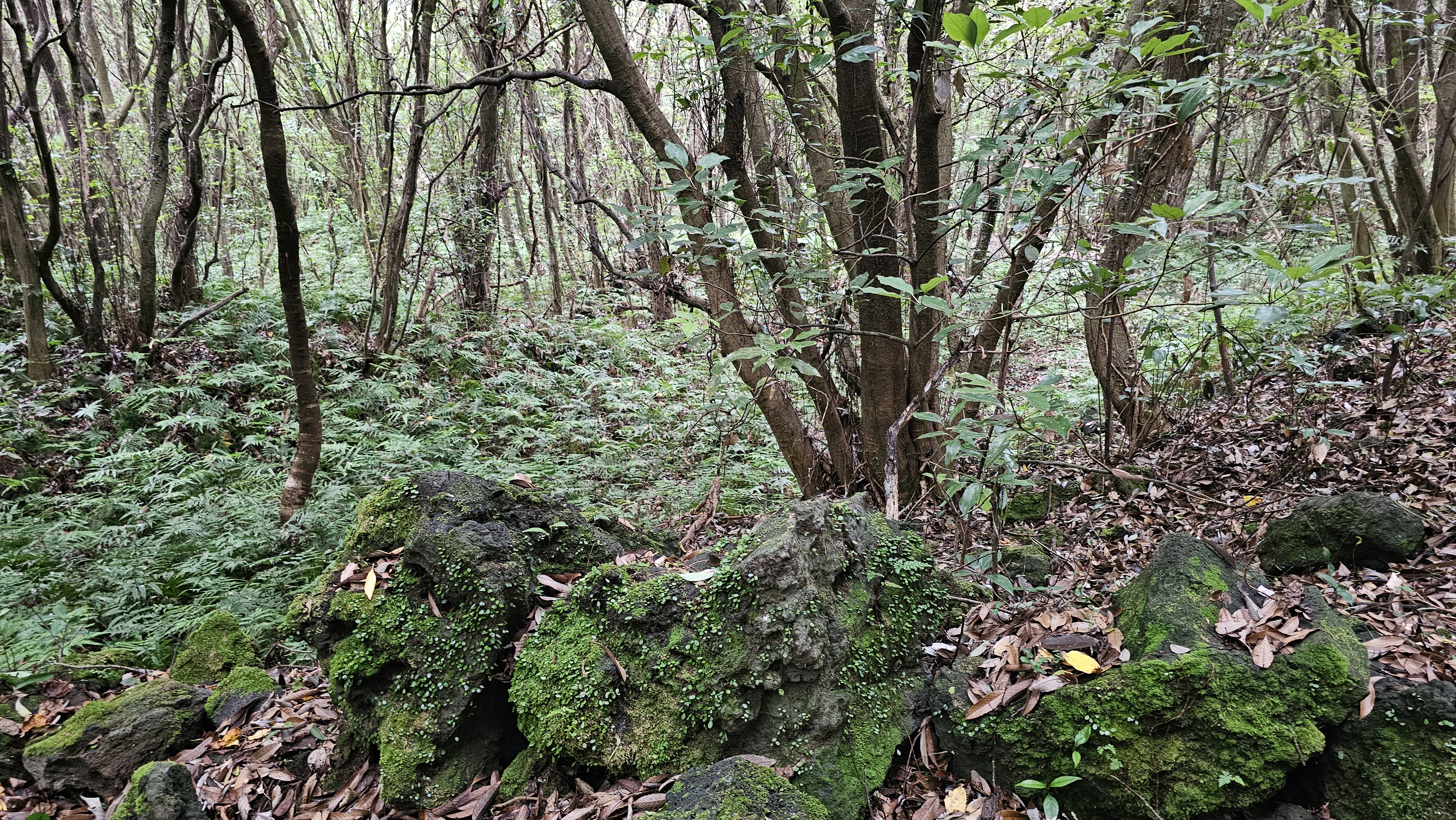돌 위를 덮어버린 착생식물과 다양한 양치식물,