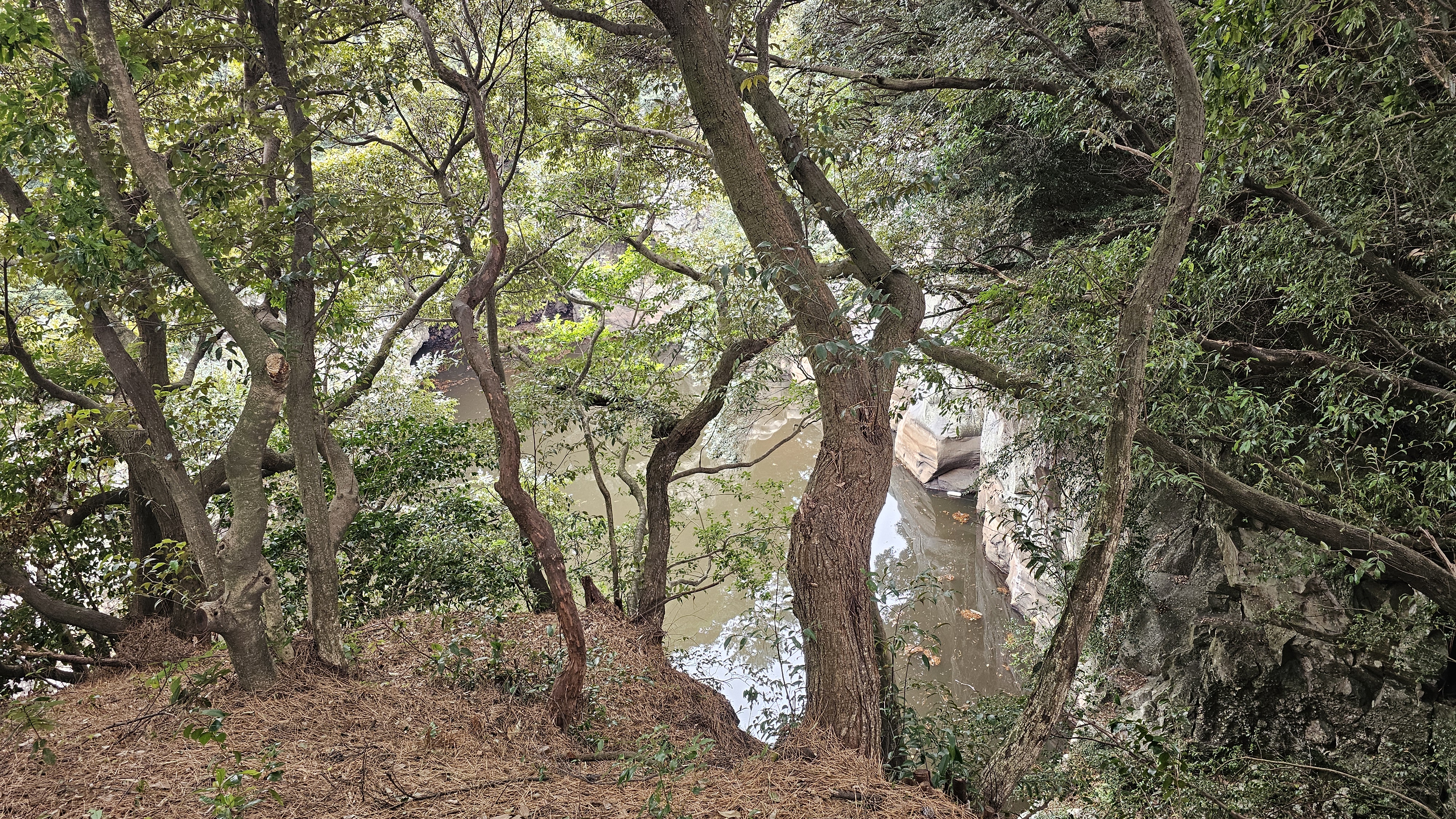 바위에 뿌리를 내린 울창한 나무, 암석, 돌 하나하나가 조각품이다.